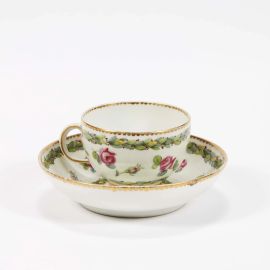 in porcellana, tazzina di forma emisferica con ansa ad anello, piattino circolare con piede ad anello. Decoro a roselline comprese in ghirlande fogliate. Marca Sèvres in blu; tazzina alt. cm 5, piattino diam. cm 13,2