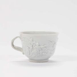 in porcellana, forma a ciotola con ansa a ramo intrecciato. Decoro acromo a bassorilievo istoriato; alt. cm 5,5