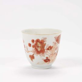 in porcellana, forma a campana su piede ad anello. Decoro policromo “al galletto”, qui eseguito in maniera molto originale; tazzina alt. cm 6,7