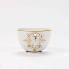 in porcellana forma a ciotola con ansa ad orecchio. Decoro “alla Sassone” in policromia e oro; tazzina alt. cm 4,9