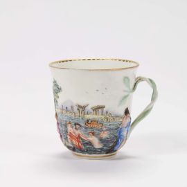 in porcellana, forma a campana con ansa a ramo intrecciato. Decoro in policromia e oro bassorilievo istoriato; tazzina alt. cm 7,5
