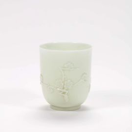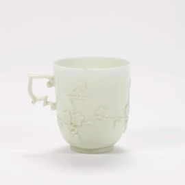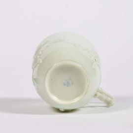 in porcellana, corpo a forma di campana con ansa mistilinea. Decoro a rilievo con fiori di pruno. Marca giglio in blu; alt. cm 7,5
