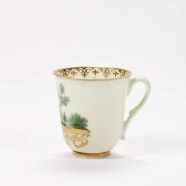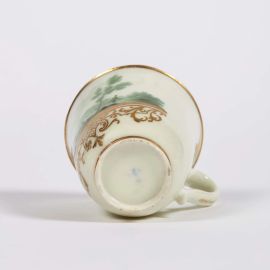 in porcellana, corpo a campana con ansa ad orecchio. Decoro a monocromia verde con paesaggio e personaggio, mentre un complesso fregio in oro, riprodotto in modo più semplice all’interno dell’orlo, completa la decorazione. Marca giglio in blu; alt. cm 7