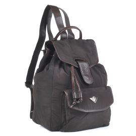 In tessuto marrone scuro leggermente imbottito con profili in pelle tono su tono con tracolle regolabili e manico. Metalleria in color argento e tasca frontale con logo.