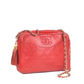 Camera bag in pelle trapuntata rossa con logo frontale e tasca aperta; chiusura con zip e tiralampo in catena con nappa in pelle e logo. Tracolla in catena e metalleria in color oro. Anno di produzione 1986.