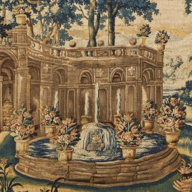 raffigurante architettura in un giardino con al centro fontana zampillante, vasi di fiori e una volpe inseguita da un cane, entro bordura a motivi floreali con uccellini, cm 315X264