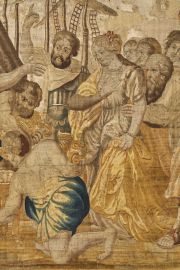 tessuto in trama di lana e ordito in seta raffigurante l’episodio di Briseide restituita ad Achille da Nestore dalla serie delle Historiae di Peter Paul Rubens; entro ricca bordura costituita da due cariatidi femminili impreziosite da fiori sulla cui testa poggiano volute fogliacee attorno alle quali si avvolgono festoni di fiori che si portano verso il centro superiore a inquadrare una conchiglia, cm 356 x570