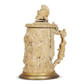il corpo in avorio intagliato con scena di battaglia con cavalieri, ansa in foggia di erma maschile raffigurante guerriero, coperchio intagliato a motivi fogliacei sormontati da panoplia con elmo, scudo e spade, guarnizioni in metallo, alt. cm 30,5