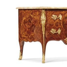 lastronata in bois de rose e altre essenze pregiate con applicazioni in bronzo dorato, piano in marmo giallo reale rosato di linea sagomata, impreziosita da applicazioni in ormoulu a motivi fogliacei su bocchette, pendaglina e angoli superiori dai quali ricadono in esile filettatura fino ai sabots sui piedini. Il fronte elegantemente bombato a due cassetti sans traverse, ornati al centro da motivo a cartouche a inquadrare racemi tra riserve sagomate a volute, fianchi analogamente intarsiati, gambe a sciabola, stampigliata sul piano CM COCHOIS; cm 87x129x63