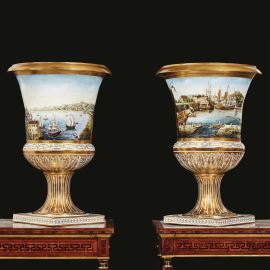in porcellana dipinta in policromia e oro, di forma medicea con base quadrangolare ornata a piccoli cerchi incrociati su cui poggia il piede cilindrico decorato a baccellature, corpo interamente dipinto con grande veduta di Napoli sotteso da decoro a foglie sovrapposte e rivolte verso l'alto all'attacco con il piede, orlo estroflesso profilato in oro, alt. cm 100, diam. cm 68
