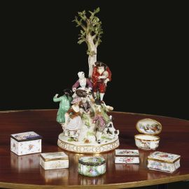 in porcellana dipinta in policromia, gruppo realizzato con scena di festa campestre con suonatori su base naturalistica con albero, alt. cm 48, scatoline con montature in metallo argentato e dorato decorate con paesaggi, scene galanti, vedute di città e motivi floreali, la più grande cm 6x9x6,5