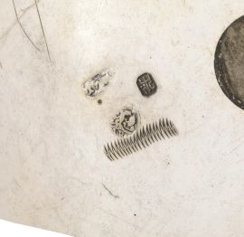 in argento e vermeil, tre piedini a sfera sbalzata a foglie, corpo cilindrico decorato con riserve ovali entro cui sono incise scene di putti e animali, paesaggi con volatili ed elementi vegetali, presa a voluta, coperchio piatto riccamente inciso a girali di foglie, al centro medaglione con cervo e fanciullo, alt. cm 19, g 830