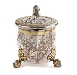 in argento e vermeil, tre piedini realizzati come boccioli di fiori uniti al corpo da grandi foglie in rilievo. Corpo cilindrico inciso a volute vegetali che incorniciano due riserve entro cui si svolgono scene con putti che mangiano uva e suonano, fronte con due stemmi nobiliari incisi e le iniziali FS e ALM. Presa a doppia voluta e coperchio decorato in rilievo con Venere e Cupido, alt. cm 20, g 1365