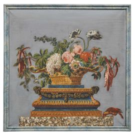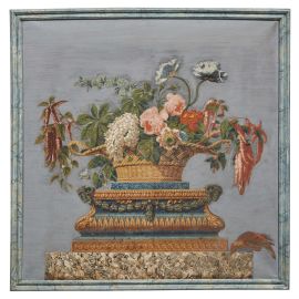 tempera su carta applicata su tela, raffiguranti vasi di fiori e volatili, entro cornici dipinte a finto marmo, cm 88,8x121,3 (1) e cm 94,3x95 (2) complessivamente