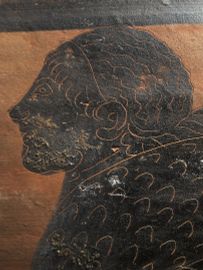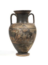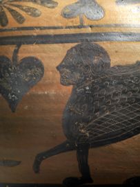Quest’anfora, di grandi dimensioni, può essere ascritta forse alla principale officina ceramica del tardo VI secolo in Etruria, quella del Pittore di Micali, oggetto di una puntuale revisione negli ultimi decenni: si vedano N.J. Spivey, The Micali Painter and his followers, Oxford 1987; Un artista etrusco e il suo mondo. Il Pittore di Micali. Roma, Museo nazionale di Villa Giulia (22 marzo - 30 giugno 1988). Gli animali mostruosi, come chimere oppure sfingi sono caratteristici della produzione del ceramografo, dove compaiono con elementi ricorrenti: M. Wullschleger, Figure ibride e animali fantastici nel Gruppo di Micali, in Nuovi studi sul bestiario fantastico di età orientalizzante nella penisola italiana, Trento 2016, pp. 395 – 408. Il tipo di sfinge trova precisi confronti con un’anfora a Monaco di Baviera (Antikensammlungen, inv. SH845; BAPD 9034614; Y. Olivier-Trottenberg, a cura di, CVA Corpus Vasorum Antiquorum. Deutschland. München 17. Etruskisch Schwarzfigurige Keramik, tav. 26, pp. 63-64, con ulteriori confronti).