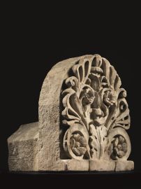 Antefissa in marmo bianco a grana fine, che conserva parte della terminazione di un coppo con l'antistante fastigio. La decorazione realizzata a rilievo molto aggettante è composta da una palmetta acantiforme con costolatura centrale rilevata, da cui si diparte uno stelo vegetale con coppia di calici sovrapposti e fiore d'abaco. Nel campo figurativo, ai lati della palmetta e dello stelo, si sviluppano due tralci vegetali elaborati con quattro rosette, due alla base della decorazione e due ai lati dei calici. H. 43,8 cm; largh. 37,5 cm.