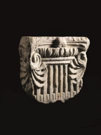 Capitello di lesena in marmo bianco composto nel tratto superiore da un abaco a doppia modanatura che presenta al centro un resto di fiore. L'echino è costituito da un motivo ad ovuli e fiori di loto alternati, posto sopra un elemento tortile. Gli angoli dell'echino sono costituiti da due volute da cui si diparte una palmetta aperta. Il tratto inferiore del capitello è costituito da una membratura ionica. Il retro è scavato a punta per l'inserzione nella struttura architettonica. H. 37 cm; largh. max. 39,5 cm; spessore 15 cm ca.