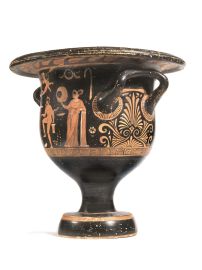 Grande cratere a campana con orlo svasato ingrossato, corpo campaniforme, stelo cilindrico, piede ad echino con una modanatura. Sopra il punto di massima espansione sono impostate due anse orizzontali a profilo sormontante. La decorazione figurata consiste sul lato A in una scena con un giovane nudo (Dioniso?) seduto con una phiale ed un tirso, verso cui si dirige un satiro con kantharos e cestello in mano. Osserva la scena una figura femminile appoggiata ad un pilastrino con un tamburo in mano ed un tirso nell'altra. Sopra queste tre figure è un erote androgino alato. Sul lato B sono due giovani ammantati appoggiati ad un bastone, ambientati in una scena di conversazione in palestra. Fra di loro un elemento vegetale. La decorazione secondaria consiste in una corona di foglie di alloro o olivo sotto l'orlo, un meandro alla base della decorazione figurata e in un elaborato motivo di palmette sotto le anse, a loro volta racchiuse da tacche verticali. H. 46,4 cm; diam. orlo 47,2 cm.