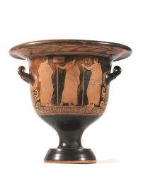 Grande cratere a campana con ampio orlo svasato ingrossato, corpo a campana, lungo stelo cilindrico, piede troncoconico con una modanatura nel suo tratto superiore. Anse orizzontali a sezione circolare a profilo sormontante. La decorazione, a figure rosse, consiste sul lato A in un gruppo di tre figure. Una figura maschile seminuda, seduta e con una grande phiale nella destra ed un lungo tirso nella sinistra viene incoronato da un satiro, anch'esso contraddistinto da un tirso appoggiato ad un pilastrino / roccia naturale. Davanti alla figura maschile è collocata invece una donna ammantata, con capelli raccolti in un kekryphalos, che regge una cista quadrangolare. Sul lato B scena di conversazione in palestra con tre giovani ammantati, due dei quali si reggono ad un bastone. Sotto le anse, marginate alla loro base da file di tacche, è un motivo con una doppia palmetta. H. 39 cm; diam. orlo 44 cm; diam. piede 20 cm.