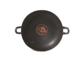 Kylix di tipo A, con orlo indistinto, ampia vasca, basso piede a tromba raccordato alla vasca da un collarino. Due anse orizzontali sono impostate sul tratto inferiore della vasca. La decorazione figurata, analoga su entrambi i lati del vaso, consiste in due grandi occhioni, con caruncola lacrimale accentuata e indicazione accurata delle pupille (con cerchi concentrici in vernice sovraddipinta bianca). Fra gli occhi si trova il dio Dioniso semisdraiato, con gambe allungate e torso sollevato, coronato di edera e raffigurato nell'atto di interagire con un satiro, che si muove verso di lui porgendogli una corona. Intorno al dio si vedono tralci di vite; tralci di vite con grappoli si intrecciano anche negli ampi spazi fra gli occhi e al di sotto delle anse. Al centro della vasca, è un gorgoneion posto entro un tondo. Diam. 27 cm; Largh. max. 35 cm; h. 11,4 cm.