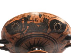 Questa coppa, ascrivibile con certezza ad una produzione attica della fine del VI secolo a.C. per il tipo della decorazione e l’associazione fra il motivo ad occhi e la testa di Gorgone nel tondo centrale, è caratterizzata nel suo complesso da soggetti destinati ad esaltare il dio del vino e dell’ebbrezza, che viene mostrato su entrambi i lati della coppa, con piccole varianti, mentre è onorato da un membro del suo corteggio.