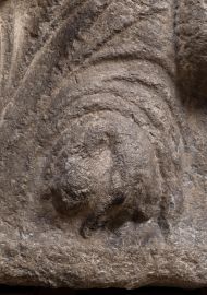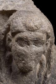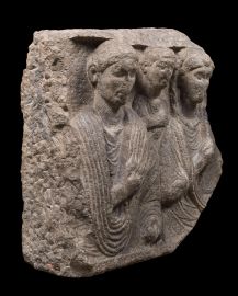 Grande rilievo in pietra calcarea che mostra una coppia con un bambino affacciata ad un elemento quadrangolare (cornice), conservato in particolare in corrispondenza del margine superiore e laterale sinistro. L’uomo, conservato quasi fino all’altezza della vita, è totalmente avvolto in un’ampia toga e regge con la mano sinistra, parzialmente nascosta dalla veste, un oggetto cilindrico (papiro ?), mentre porta la destra sul petto. La donna indossa anch’essa una lunga veste, mossa da numerose incisioni, un lembo della quale è sollevato sul capo: porta anch’essa la mano destra sul petto, mentre la destra, che doveva essere originariamente abbassata non è conservata. Fra i due adulti, in alto, si vede chiaramente un fanciullo, vestito con una tunica, e rappresentato mentre sfiora con la mano destra il gomito sinistro. La capigliatura, conservata solo in parte, presenta i capelli tirati all’indietro Sul suo petto si vede una bulla rilevata. 97 x 94 x 36 cm.