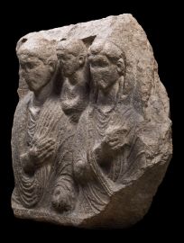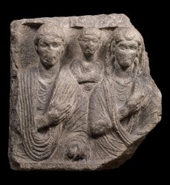 Questo rilievo è ascrivibile ad una categoria molto specifica di monumenti databile fra la tardissima età repubblicana, nel I secolo a.C. e la prima parte del I secolo d.C.: quella che raffigura i busti di intere famiglie come affacciati da profonde nicchie murate nei sepolcri antichi. In questo caso l’idea non è tanto quella di fissare alle pareti le immagini degli antenati, ma quella invece di rappresentare il monumento come una casa con nicchie e finestre, da cui si affacciano i membri delle famiglie del ceto medio, rappresentati in momenti di affetto reciproco e con tutti gli elementi utili a definire il loro status ed il loro rango (in questo specifico caso, ad esempio, la bulla del fanciullo e la toga ed il rotolo di papiro dell’uomo). Questo costume è ben riscontrabile non soltanto nella città di Roma (basti pensare a tal proposito ai monumenti rinvenuti lungo la via Statilia, ancora in situ, od ai rilievi ai Musei Vaticani o al Museo Nazionale Romano), ma anche in gran parte della penisola, dalla Campania alla Cisalpina (si veda a tal proposito i numerosi esempi presentati in H.G. Frenz, Römische Grabreliefs in Mittel-und Süditalien, Roma 1985). Fra le immagini in cui compaiono coppie con figlio al centro, possiamo ricordare il rilievo ai Musei Vaticani, (Galleria Lapidaria XV 80, inv. 9398; Arachne n. 20740). Per quanto riguarda l’aspetto, molto specifico, della capigliatura della figura femminile, nonostante l’usura è possibile riconoscere in esso l’elemento rilevato al centro della fronte che caratterizzata uno dei tipi iconografici della moglie di Augusto, l’imperatrice Livia (tipo Copenaghen 616, si noti in particolare la presenza dei due riccioli che ricadono sulle spalle, a differenza del vicino tipo Copenhagen 615). Un’acconciatura avvicinabile compare in un busto femminile ad altorilievo rinvenuto al sesto miglio della via Appia (Arachne n. 1087994) o nelle tre figure femminili in un celebre rilievo ai Museo Museo Gregoriano Profano ex Lateranense (inv. 10464; F. Sinn, Reliefs, Altäre, Urnen, Museo Gregoriano Profano ex Lateranense. Katalog der Skulpturen 1.1, Magonza 1991, pp. 30-31, n. 9).