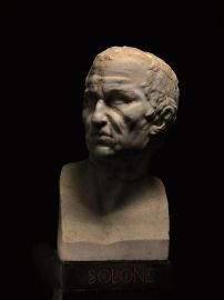Busto in marmo bianco su cui è montata una testa ritratto di uomo di età matura. Il volto, dagli zigomi scavati e con evidenti segni dell’età sul viso, riscontrabili in particolare nelle palpebre inferiori e nelle rughe di espressione sulla fronte, si presenta marcatamente inclinato verso destra. I capelli, resi da sottili incisioni, sono portati avanti sulle tempie e dalla sommità del capo scendono radi sulla fronte con una evidente stempiatura. Il busto, tagliato prima dell’inserzione delle spalle e sopra i pettorali (in modo di assomigliare ad un’erma) era identificato come figura del legislatore greco Solone, pur non presentando alcuna connessione con il tipo ritrattistico ascritto al nomoteta (cfr. l’erma di Solone agli Uffizi, inv. 1914 Nr. 377). H. max. del busto 32,5 cm. H. base 4,6 cm.
