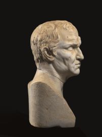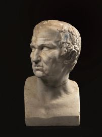In questo ritratto, leggibile con chiarezza nonostante la politura di parte delle superfici e le piccole reintegrazioni (sul naso), può essere riconosciuta l’immagine di un privato databile alla tarda età repubblicana. In particolare, nel marcato infossamento degli occhi, nella torsione del capo e nel patetico sollevare dello sguardo sembra essere riconoscibile l’adesione a modelli colti, ellenistici, usati per stemperare il ‘realismo’ tipico della ritrattistica romana, finalizzato in particolare a far rilevare la severitas e la dignitas dell’effigiato.