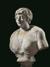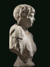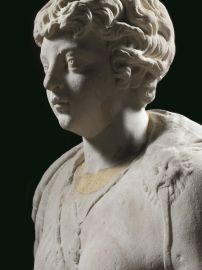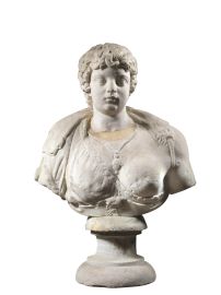 Busto monumentale su cui è montata una testa di fanciullo di dimensioni maggiori del vero. La testa raffigura un fanciullo dal volto paffuto, con ampia fronte su cui ricade un’elaborata corona di riccioli che coprono le orecchie, grandi occhi, naso corto con la punta arrotondata e labbra carnose. Il busto, anch’esso in marmo è femminile e può essere identificato con quello di un’amazzone: lascia scoperto il seno sinistro mentre quello destro è nascosto da una veste connessa in parte ad una testa animale, che ricade sulla spalla sinistra. Alla base del busto si vede un mascherone mostruoso a bocca spalancata. Sul petto, fra i seni, cade una collana con un grande pendente ovale con quattro elementi circolari. Il busto è montato su una base modanata in pietra di colore grigio. H. 103 cm; largh. max. 71 cm; prof. 28 cm.