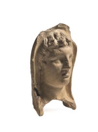 Testa maschile votiva a mezzo tondo raffigurante un giovane con occhi fortemente chiaroscurati con accentuazione delle palpebre, naso rettilineo, piccola bocca con labbra carnose socchiuse, mento arrotondato. I capelli sono mossi, con piccole ciocche mosse ricadenti sull’ampia fronte. Il retro non si presenta lavorato. H. 25,8 cm.