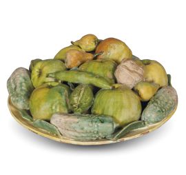 La coppa ha forma emisferica con piede a disco e ampia tesa estroflessa e piana che termina in un orlo liscio. Sulla coppa sono applicati frutti, ortaggi, frutta secca e alcuni baccelli di legumi (pere, mele, cetrioli, noci, mandorle e fave). Sul retro spicca un decoro a petal back nei toni del blu e dell’arancio con piccoli rombi centrati da crocette a risparmio.
