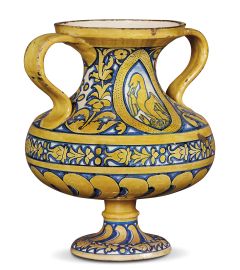 Il vaso ha un riscontro preciso in un esemplare appena più piccolo, con animali riferibili all’amor cortese, studiato recentemente da Timothy Wilson nel regesto di una collezione privata. L’ornato con fiori a bocciolo inoltre è facilmente riferibile alla tesa di un piatto del British Museum dalla tesa decorata a ghirlanda recante lo stemma di papa Giulio II, e pertanto databile tra il 1503 e il 1513, gli anni del suo pontificato, termine utile anche per la datazione del nostro vaso, riferibile al più tardi agli anni venti del XVI secolo.