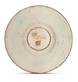 in maiolica dipinta in policromia; sul retro due vecchie etichette di collezione e frammenti di un’etichetta di esposizione; diam. cm 25,8, diam. piede cm 8,5, alt. cm 3,3