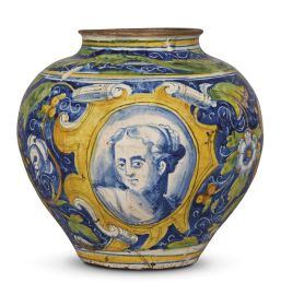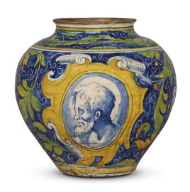 Questo vaso si distingue dalla produzione più classica delle bocce con ritratto in medaglione, non solo per la tipologia della cornice, ma anche e soprattutto per la qualità dell’esecuzione dei ritratti in monocromo. Le dimensioni classiche, la varietà nei ritratti e l’assenza del cartiglio con l’indicazione del preparato farmaceutico fanno pensare all’intervento nell’opera di prestigio della mano di un “pittore magistrale” per un fornimento di prestigio.