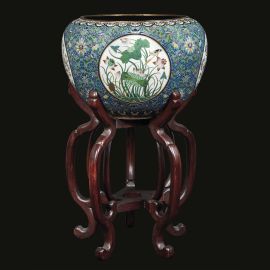 in cloisonné decorata con fiori entro riserve, fogli e volute; diam.46,5 alt.33