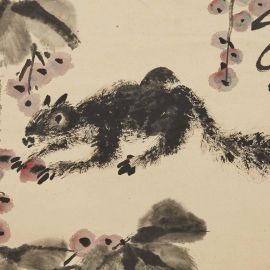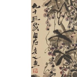 ad inchiostro su carta, raffigurante scoiattolo e rami uva, con firma Qi Bai Shi齐白石; cm 98x33,5