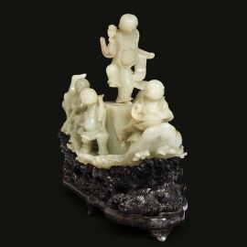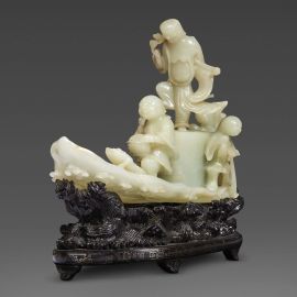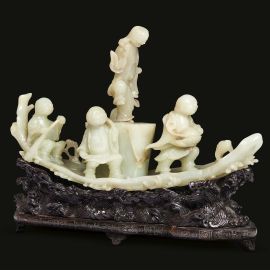 in giada verde pallido, lavorato a forma di barca con quattro personaggi che remano in mezzo alle ricche onde, base in legno zitan; alt. cm 17x29x9,5