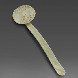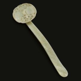 in giada verde pallido, raffigurante scettro con la testa la forma di Ruyi scolpita con due pesche; il manico modellato a S scolpito con pipistrelli e nuvole; lung. cm 30