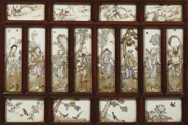 晚清 十九至二十世纪 硬木嵌八仙人物花鸟纹瓷板屏风