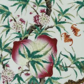 in porcellana policroma nei colori della famiglia rosa, decorato con rami di pesco fioriti, due pipistrelli in rosso ferro: la pesca è simbolo di longevità, la parola pipistrello in cinese si pronuncia come Fu (divinità taoista), il quale è portatore di felicità e fortuna, reca marchio Qianlong sottostrato a sei caratteri in blu; diam. cm 50,5