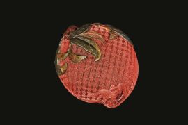 in lacca policroma, raffigurante pesca con rami e foglie; cm 4,7x7,8x6,3