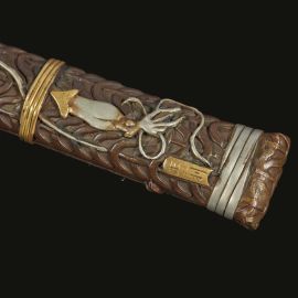 in bronzo, manico lavorato a rilievo con aragosta, granchio e altri pesci, lama incisa con volatili e pipistrelli, reca firma sul manico Masatoshi (importante famiglia di orafi giapponesi); lung. cm 25,2