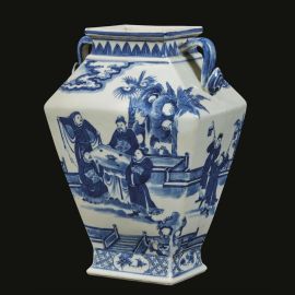 in porcellana bianco-blu, di forma squadrata con prese a forma di scettro, dipinto con personaggi in un esterno; alt. cm 24,5