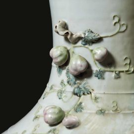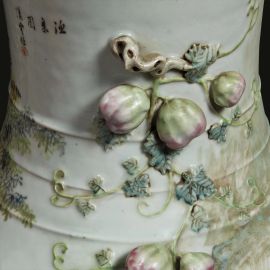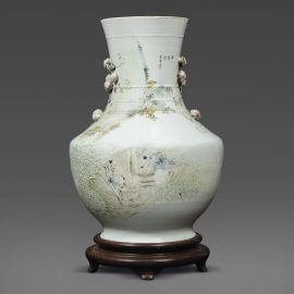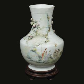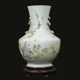 di forma Hu, in porcellana policroma, collo alto e svasato con anse formate da viticci di zucca in rilievo, sulla pancia sono presenti scene dipinte nello stile Qianjiang dal maestro Wang Zhang (汪章,字汉云,晚清瓷绘名家): Feng Chen San Xia e Yu Le Tu.; il vaso è stato creato nel 1885乙酉, raro per qualità pittorica e grandezza con marchio Qianlong apocrifo; alt.cm 58