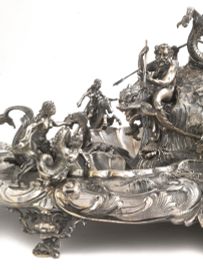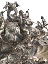in argento, realizzata come una grande conchiglia su cui poggiano nereidi su cavalli marini e animali acquatici, al centro uno scoglio con animali acquatici cavalcati da tritoni, alt. cm 34, cm 57x74, completa di motore, g 14900 lordi