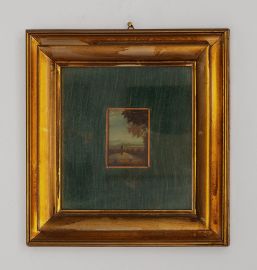 Coppia di piccoli rami dipinti con paesaggi con figure, sec XIX?, cm 9,5x 7,5, applicati su pannelli rivestiti in velluto verde entro cornici in legno dorato, cm 28x28