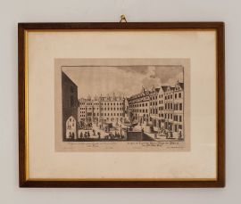 Coppia di riproduzioni raffiguranti vedute di Praga, sec XVIII, su tela, cm 28x36,5, entro cornici in legno