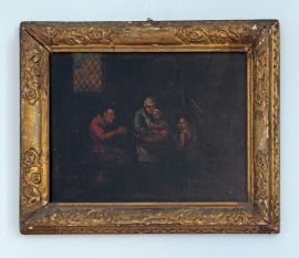 Artista Fiammingo sec XVIII. Coppia di scene d'interno con cucina, figure di adulti e bambini, olio su tavola cm 30x30,9 entro cornici coeve in legno dorato e intagliato con fiori, alcuni danni alle cornici