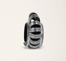 Bracciale “slap on” realizzato con pellame di prima scelta recuperato dal mondo del lusso e riutilizzato, con chiusura effetto avvolgente, lungh cm 23 e h cm 4